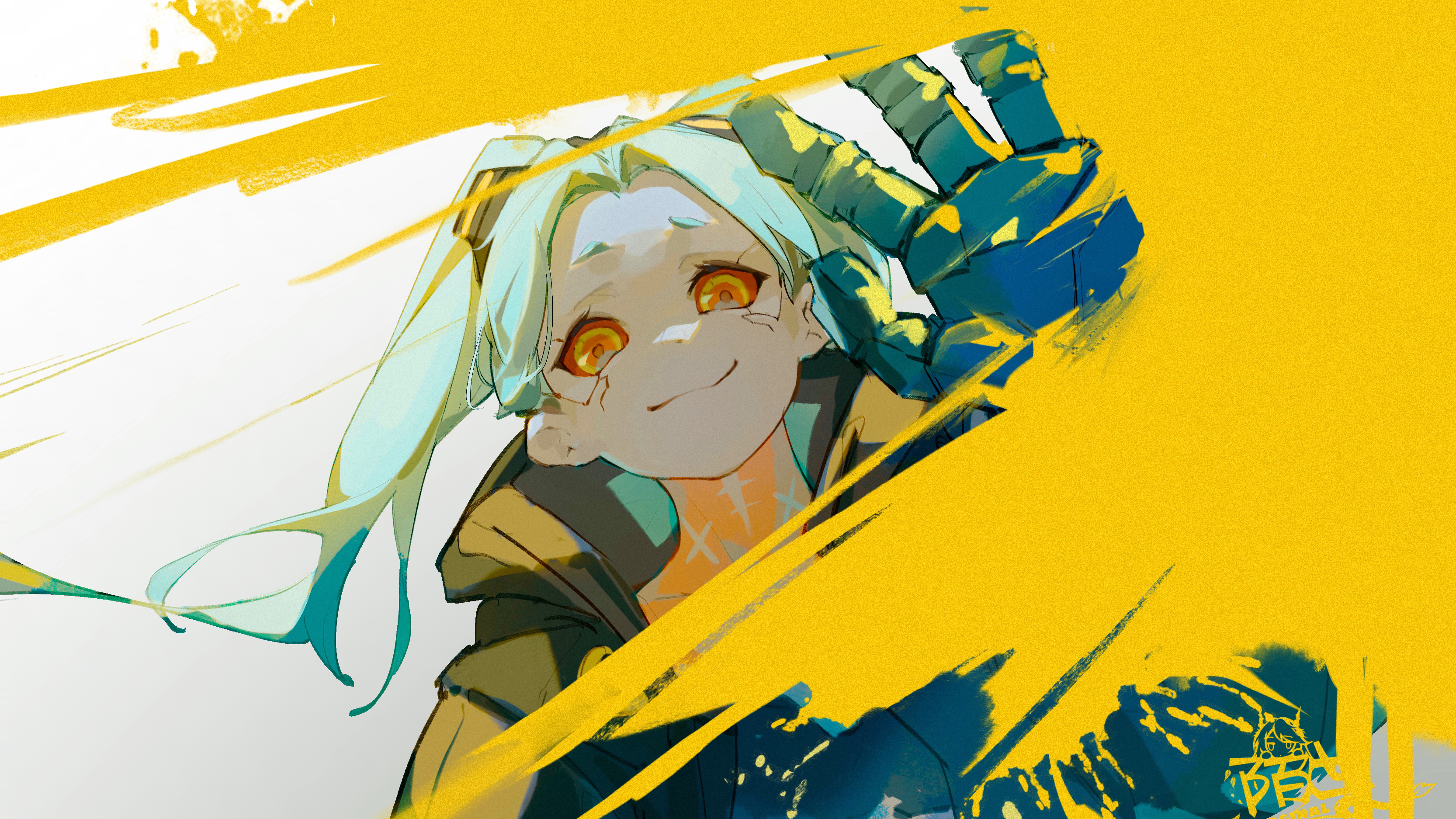 - girl · female character · robotic arm · cybernetic arm · ponytail · pigtails · jacket · abstract · white background · yellow background · paint strokes · splashes · playful · cheerful · energetic · happy · anime style · digital art · cyberpunk style · vibrant · expressive · graphic · yellow · white · teal · blue · orange eyes · green hair · peach skin · pe