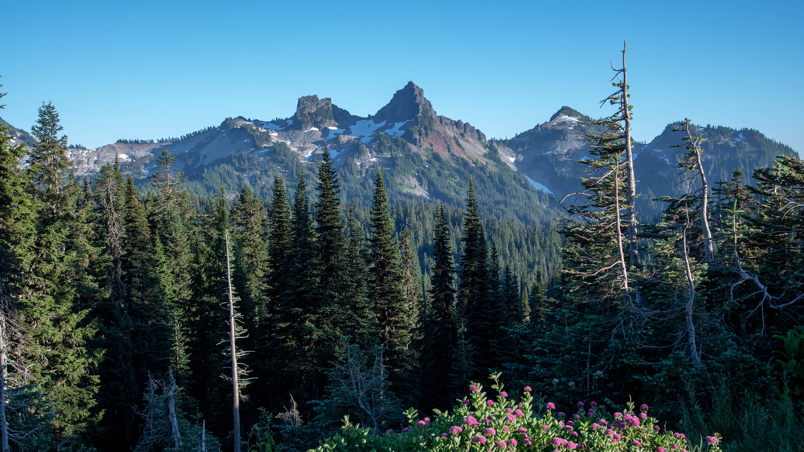 Filename 42393447680bd8900e509o.jpg Resolution 2560 × 1440 Format jpeg Megapixels 3.7 MP Added Jan 3, 2026 Colors #0c1f1e · #485e5a · #74bce5 Keywords mountain · forest · trees · blue sky · snow patches · jagged peaks · green · pink flowers · daytime · landscape