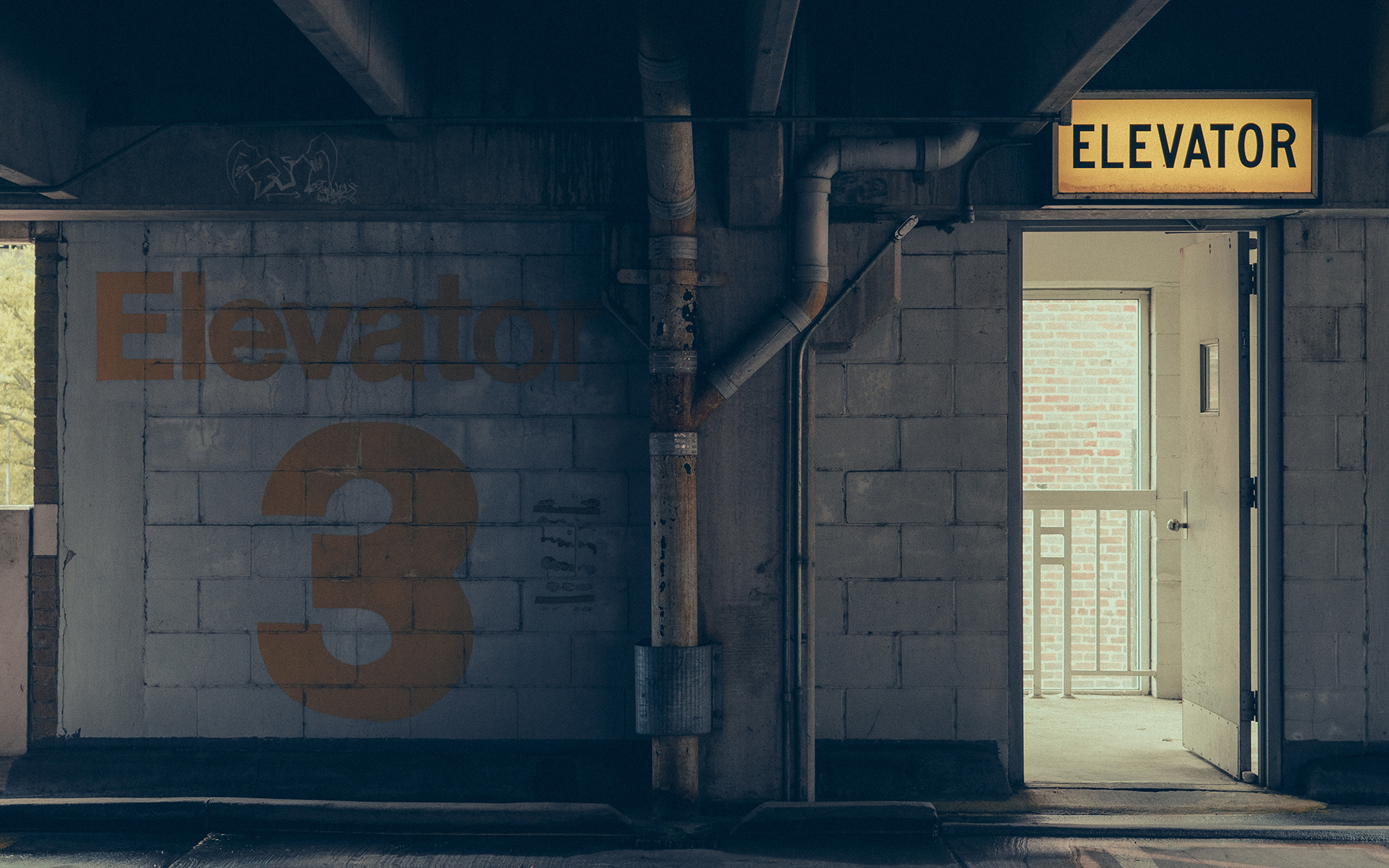 Filename andrewwelch290679.jpg Resolution 1920 × 1200 Format jpeg Megapixels 2.3 MP Added Jan 3, 2026 Colors #33393d · #928665 · #bcc3a1 Keywords elevator · brick wall · pipes · doorway · sign · industrial · muted colors · urban · grungy · parking garage