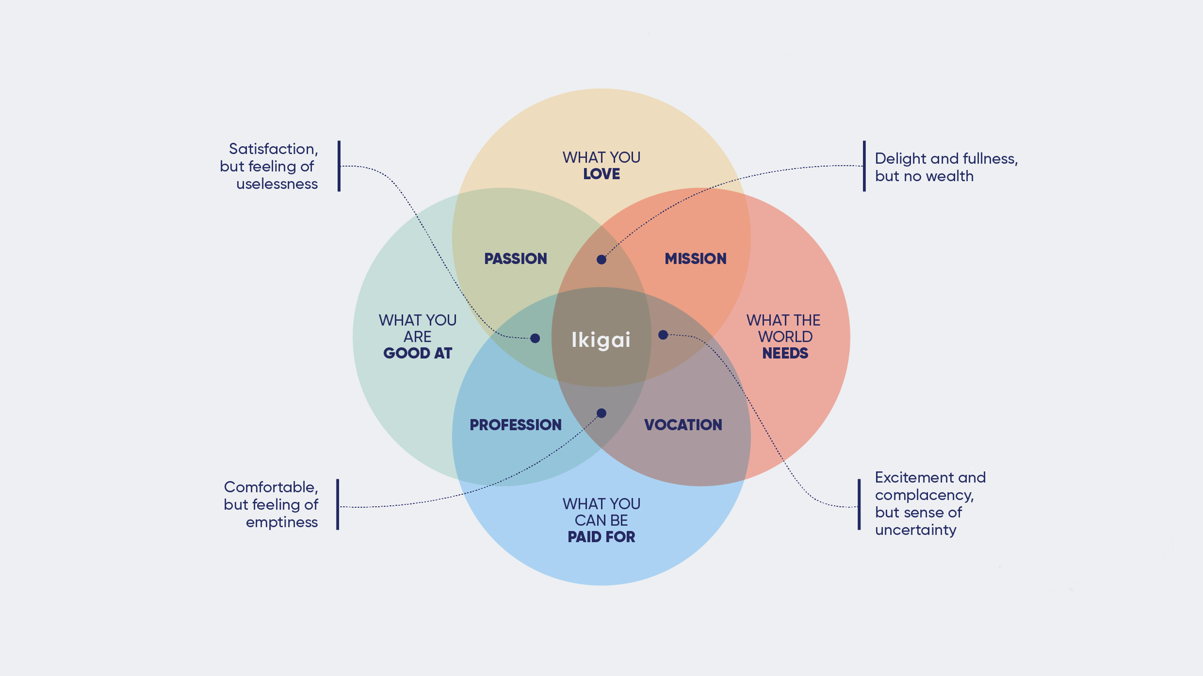 - venn diagram · circles · ikigai · what you love · passion · mission · what the world needs · vocation · profession · what you are good at · what you can be paid for · satisfaction · emptiness · complacency · wealth · uncertainty