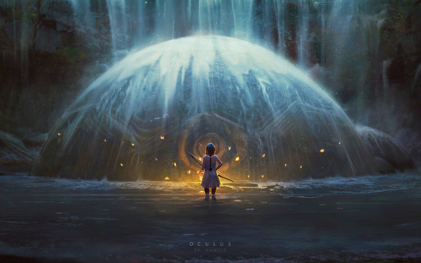- girl · bow · water dome · waterfall · glowing light · mysterious · fantasy art · blue · orange · dark · magical · atmospheric · water · ripples · cave · rocks · oculus · by · guweiz