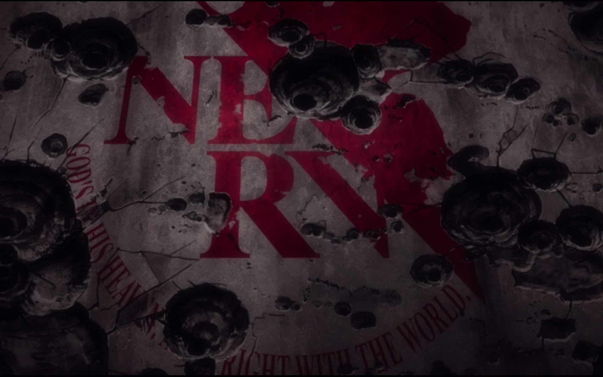 - nerv · god's in his heaven · all's right with the world · logo · text · distressed · cracked · holes · dark · grey · red · black · grunge · ominous · apocalyptic · anime style · graphic · symbol · damaged surface