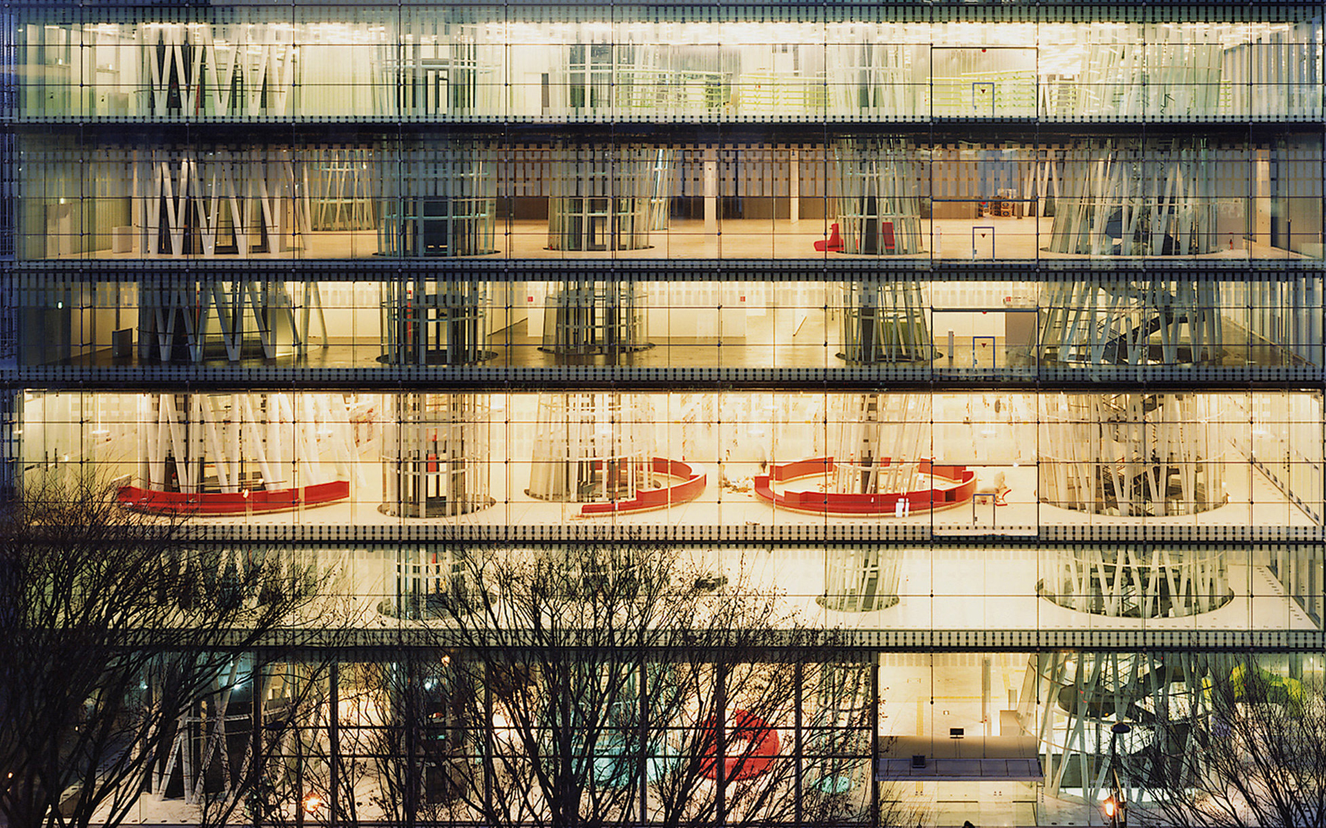 - building · modern · glass facade · windows · multiple floors · interior · columns · support beams · cylindrical shapes · red benches · bare trees · branches · lights · urban · nighttime · structured · architectural · geometric · minimalist · yellow glow · warm light · green tint · red · black · gray · white
