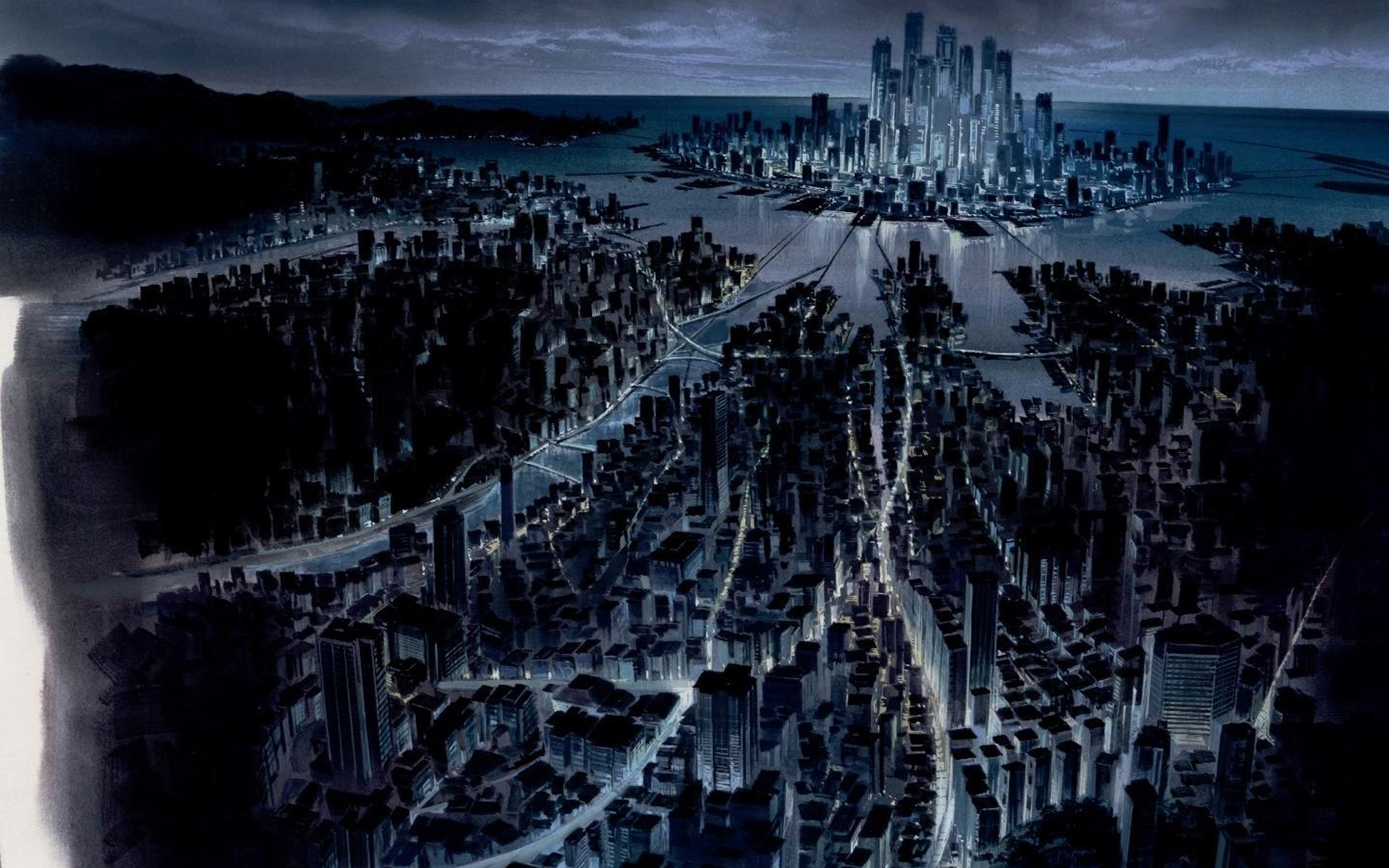 - city · cityscape · urban · buildings · skyscrapers · roads · bridges · bay · ocean · water · mountains · clouds · sky · night · city lights · futuristic · sprawling · dark · mysterious · illustration · painting · anime style · blue · navy · black · gray · white · silver
